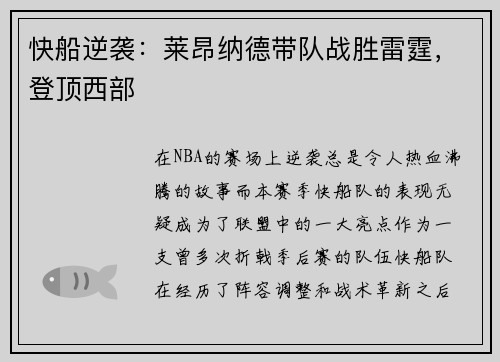 快船逆袭:莱昂纳德带队战胜雷霆,登顶西部